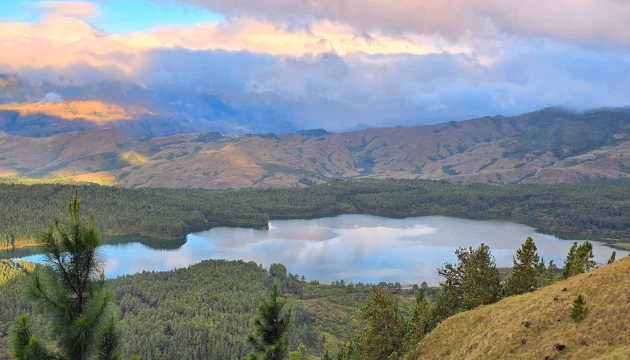 Pero la verdadera estrella del lugar es la laguna. Rodeada de montañas que parecen gigantes dormidos y pinares que susurran secretos al viento, es el tipo de vista que hace que instintivamente busques tu cámara, pero que también te paraliza porque sabes que ninguna foto va a capturar realmente lo que estás sintiendo.